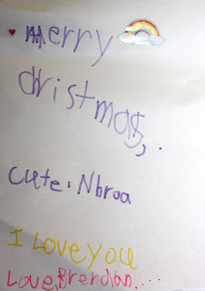 I love that he raided his sister's sticker stash to find pretty stickers that Norah would like (the rainbow sticker says "Elizabeth" on it.) And, my favorite part is "cute Nhroa." Since he's only 4, I'm not holding his lack of literacy skills against him quite yet.